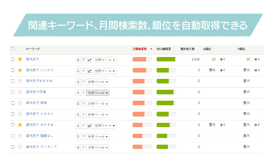 SEOキーワード分析ツール「キーワードファインダー」とは、キーワード選定や記事作成、内部対策チェック、検索順位チェック、競合比較など自動で管理できる無料から試せるツールです。